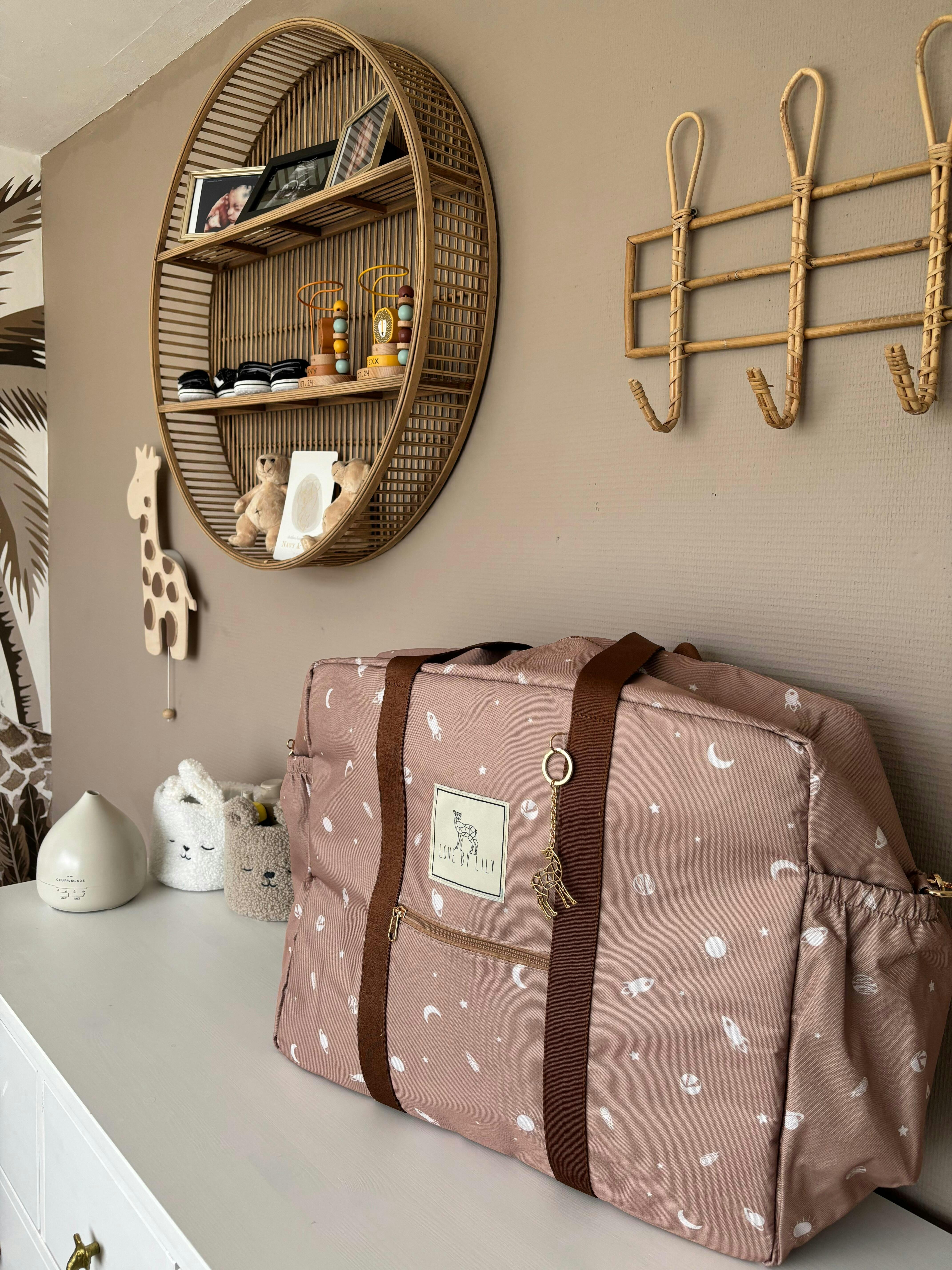 The Travel Mom Bag - My Universe is the perfect blend of style and functionality for parents who want to travel well-prepared and in style. This spacious mom bag features a warm brown color and a playful design of moons, planets, and rockets, making it a real eye-catcher. Ideal for sleepovers, day trips, vacations, or even as a maternity bag.