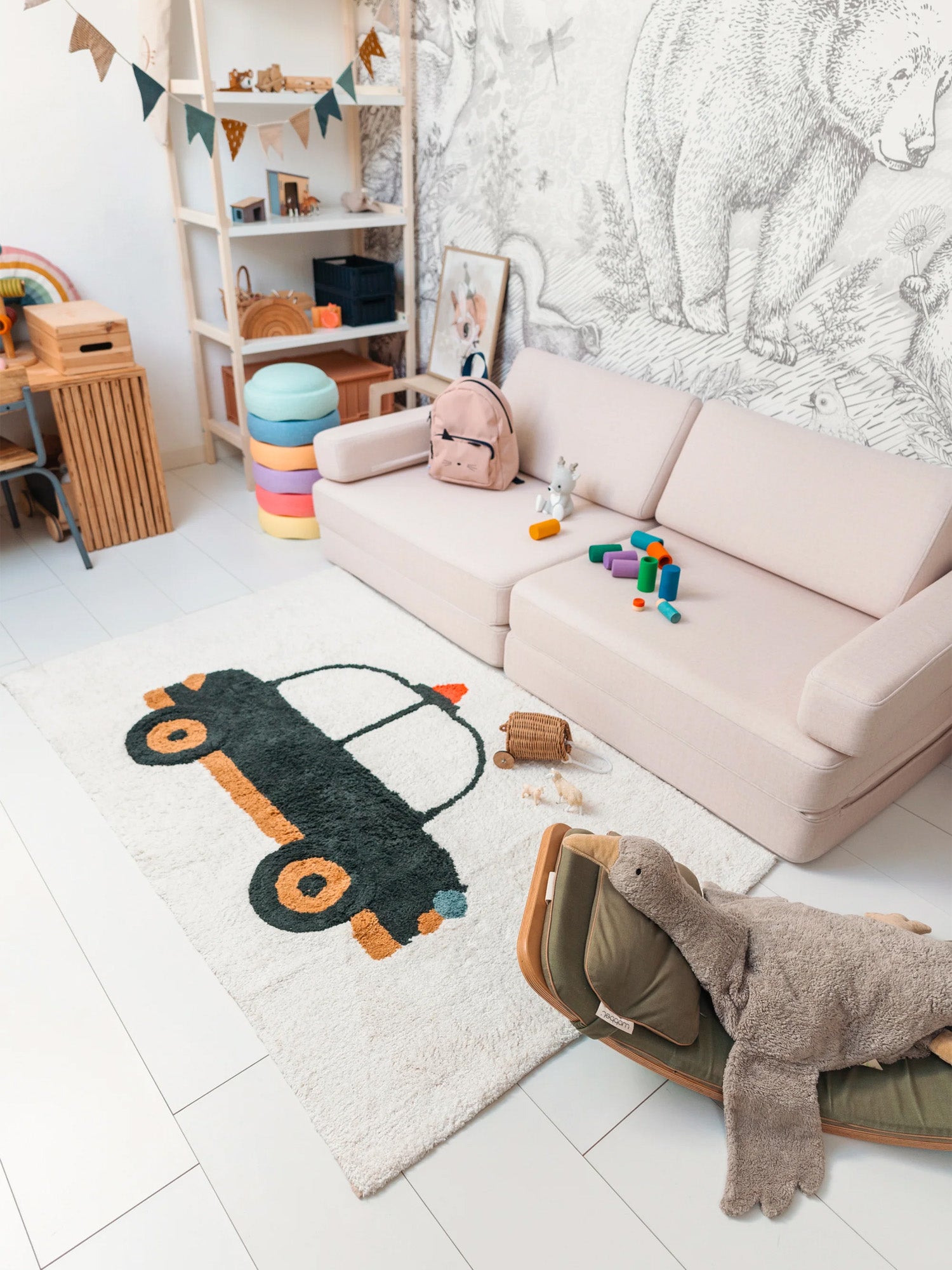Onze speelkleden, vloerkleden en behang met avontuurlijke thema’s – van dino’s tot safari – geven de kamer een unieke uitstraling. Combineer zachte materialen met krachtige kleuren voor een ruimte die uitnodigt om te spelen, te bouwen en te dromen.